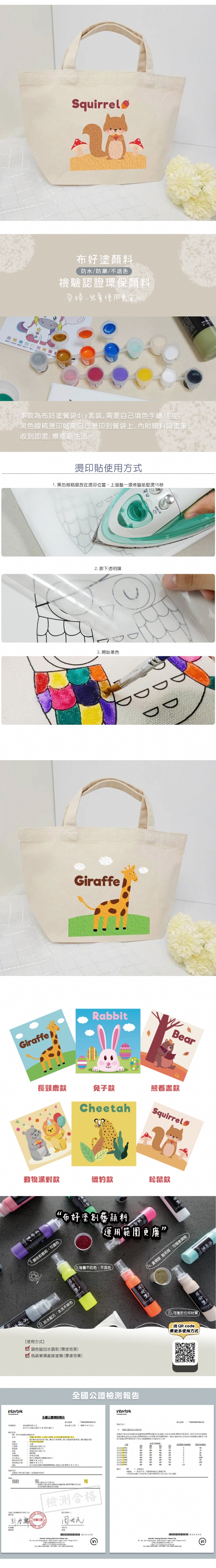 2. 線搞燙印貼 *1 3. 主題布好塗顏料*12 色 4. 參考彩圖*1 5. 烤盤紙一張 6. 尼龍筆 *2 支 7. 使用說明書*1 張 8.收納夾鏈袋1個